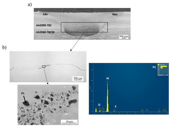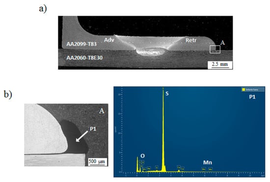 Figure 10 shows a macrograph of the weld from coupon C6 and the detailed analysis of the crevice region between both parent materials. Similarly to the results shown in Figure 6, an accumulation of sealant at the crevice region was observed in the detail A from Figure 10a, which is magnified in the image of Figure 10b. The EDS analysis of the sealant corresponding to point P1 in Figure 10b revealed a high sulphur content with lower contents of other elements such as oxygen and manganese. This result is consistent with the composition of the sealant, which is a manganese-dioxide cured polysulphide polymer system. Thus, in the same way as the sulphur content was used for the tracing and identification of aluminium oxide fragment remnants coming from the coatings produced in the TFSAA treatments, the sulphur of the sealant was used for tracing the sealant remnants that could be present at C4, C5, and C6 welds. It is important to mention that the sulphur content in the sealant is significantly higher than in the aluminium oxide fragment remnants. This fact, along with the shape of the analysed remnants, made it possible to identify clearly their origin and nature.