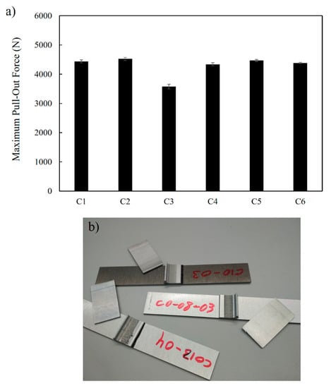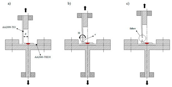 Quasi-static pull-out tests were performed in order to evaluate the influence of the coatings and sealant application in the strength of FSW welds. In these tests, the AA2060-T8E30 sheet was clamped, and a pulling force perpendicular to the weld surface was applied to the AA2099-T83 extrusion until the failure of the specimens, as shown in Figure 12. The maximum pull-out force for all specimens obtained from each FSW coupon C1–C6 as well as some examples of the failure mode observed for all specimens are presented in Figure 13. Very consistent maximum pull-out values of approximately 4.4 kN were obtained, except for the FSW specimens corresponding to coupon C3 that showed values of approximately 3.6 kN. This represents a reduction of 18% in the strength of the joints performed with Sol–Gel treated parent materials. This reduction was related to the larger distance of the weld with respect to the vertical part of the AA2099-T83 extrusion (indicated as “d” in Figure 12a), which generated a higher bending moment (M in Figure 12b) and stress concentration resulting in the failure of the stringer. This bending effect was reported by Mota de Siqueira et al. during pull-out tests carried out with similar overlap joint configurations []. For all the specimens tested in this study, the failure occurred consistently in the most stressed zone (region “e” in Figure 12b) at the AA2099-T83 extrusion outside the FSW weld region, as represented in Figure 12c. Figure 13b shows some examples of such failures.