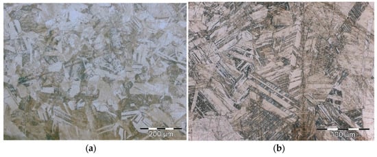 The coexistence of both phases was corroborated by X-ray diffraction measurements in agreement with the observations of other researchers [,,]. This structure is perceived with more detail in Figure 2. The SEM images clearly show the stress-induced ε-martensite formed in regularly spaced individual plates with uneven thicknesses. The twin boundaries in the γ-austenite grains are also visible.