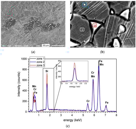 The composition of the precipitates was assessed using the EDS technique. The spectra obtained in zones 1, 2, and 3 of Figure 3b are shown in Figure 3c, and the chemical microanalysis results are displayed in Table 1. Particles located at the grain boundary have a similar composition to the surrounding matrix; however, the precipitates observed within the parent austenite grains are enriched in Mn and mainly in Si, and accordingly, they are depleted in Fe. The phase identification is discussed in the next section.