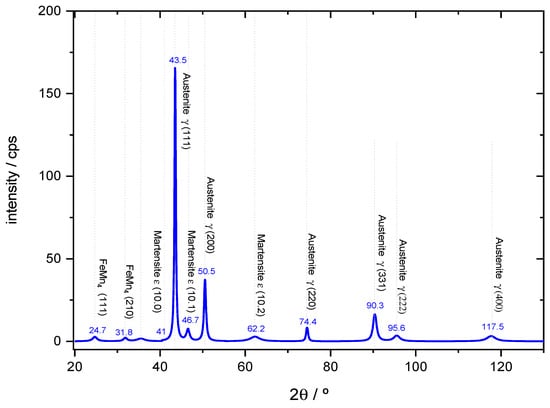 As expected, the γ-austenite is the predominant phase with the strongest diffraction peaks at 2θ = 43.5° and 2θ = 50.5°, which correspond to the reflections of (111) and (200) planes, respectively. The lower intensity peaks are located at 2θ = 74.4°, 2θ = 90.3°, 2θ = 95.6°, and 2θ = 117.5°, associated with the reflection of the (220), (311), (222), and (400) planes, as labeled in Figure 4. In addition, the ε-martensite phase is also detected, confirmed by the presence of small peaks at 2θ = 46.7° and 2θ = 62.2° ascribed to the (10.1) and (10.2) planes, respectively []. On the other hand, no peaks related to the α’-martensite (bcc) have been detected; this result is expected considering the Mn content of the studied alloy (28%wt.). Previous studies postulate that a minimum of 21% wt. Mn content is necessary to stabilize the ε-martensite in respect of the α’-martensite phase [].