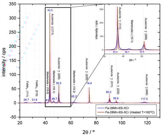 XRD patterns corresponding to the Fe-28Mn-6Si-5Cr alloy after severe straining (blue) and after heating at 180 °C for 5 min.