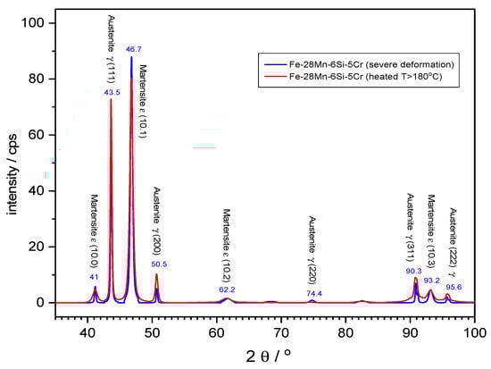 The reversibility of stress-induced martensite was investigated by Stanford and Dunme in Fe-Mn-Si shape memory alloys []. Thus, in Fe-Mn-Si alloys with 5–6%wt. Si, they observed that this reversibility is limited, mainly when they are submitted at a high strain percentage. This irreversible transformation is illustrated in Figure 6, where the XRD pattern corresponding to the highly deformed SMS alloy is compared with that obtained in the same highly deformed sample subsequently heated at 180 °C for 5 min. Although a slight increase is observed in the γ-austenite peaks’ intensity, the most remarkable feature is the presence of the ε-martensite peaks, which undergo only a small intensity decrease. This irreversibility should be related to the large volume change associated with the phase transformation, which generates dislocations that pin at phase boundary and inhibit its reverse motion [].