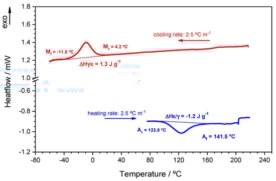 On the other hand, the heat involved in the martensitic transformation is very close to the ε → γ transformation and the reverse process, which indicates that the transformations occurred simultaneously in the whole sample. The obtained values are in the same order of magnitude as those found in the literature [,], although they can markedly differ depending on the alloy composition and on the prior thermomechanical treatments [].