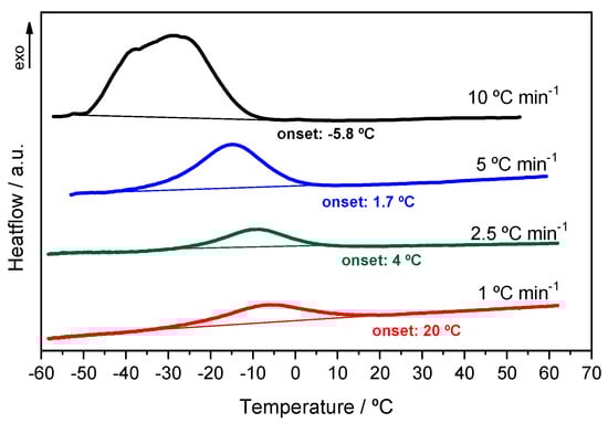 DSC curves corresponding to the γ → ε transformation at four different cooling rates. The onset is related to the Ms temperature.