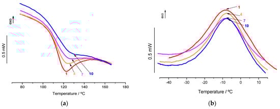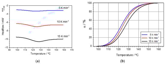 By the integration of the enthalpies recorded in Figure 11a, the transformation degree, α, can be obtained, and its evolution with temperature is depicted in Figure 11b.