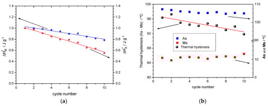 The results are plotted versus cycle number in Figure 10a. The evolution suggests that the fraction of the transformed phase slightly diminishes with the increase of the cycle number, which means that the ε-martensite↔γ-austenite transformation is not totally reversible. The magnitude of the enthalpy is also related to the amount of crystal defects, which should increase with thermal cycling, even though Marinelli et al. [] suggest that this contribution to the energy of the crystal is very small.