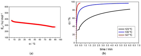 Evolution of the activation energy, Eα, with the conversion degree, α (a). Calculated isoconversion curves at three temperatures (b).