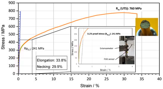 Tensile tests were conducted to characterize the mechanical properties of the Fe-28Mn-6Si-5Cr alloy. The stress–strain curve obtained at room temperature is shown in Figure 13, which also includes a detail of the setting of the extensometer and the FBG sensor in the sample. The determined values of 0.2% proof stress (Rp0.2), ultimate tensile strength (UTS), elongation (EL%), and necking (reduction of area, in percentage) are indicated in Figure 13.