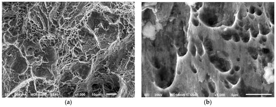 Although the mechanical properties are strongly affected by the thermomechanical history of the material (heat treatments or hot/cold working), the obtained values are in good agreement with those reported for these kinds of alloys [,]. The high elongation value justifies the surface fracture observed after the specimen breaks, characteristic of ductile fracture as can be seen in the picture included in Figure 13. In tensile tests, the ductile fracture is generated by the nucleation, growth, and coalescence of microvoids near to the center tested specimen. The examination of the surface fracture at high magnification, using SEM technique, reveals a dimpled surface, on which are traces of the microvoids generated during the fracture. Figure 14a shows the morphology of the central zone, characterized by a large number of equiaxed dimples with heterogeneous size, even though two families are predominant, with 1–2 μm and 10–20 μm diameters. The presence of precipitates of different sizes, described in Section 3.1, can explain the diverse size observed in the microvoids, since it is well-known that these particles accelerate the void-nucleation process []. Figure 14b displays the morphology in the shear lip, where the dimples are elongated and less deep.