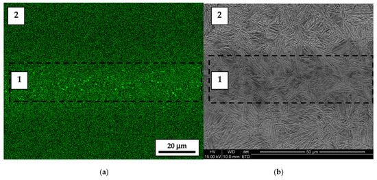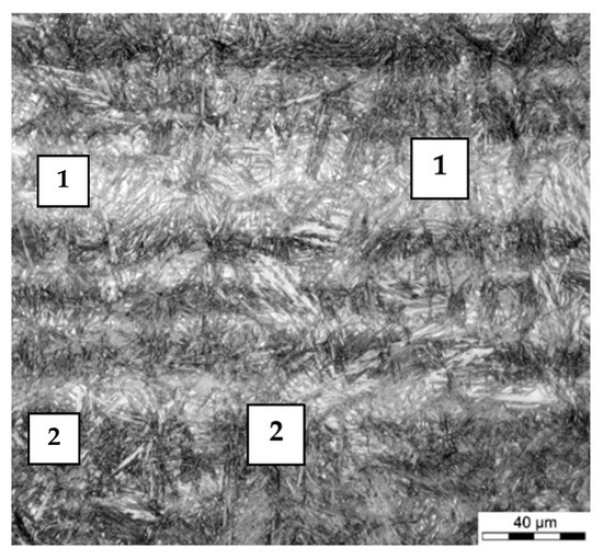 At the casting stage of the manufacturing process, a material with a primary inter-dendritic segregation is produced. A consequence of primary segregation is the banding of the microstructure especially in the final long and flat products. Through the thickness of the plates there are sequentially distributed areas with different chemical composition and morphology of microstructure components. Representative results illustrating the degree of segregation and microstructural banding in the tested material of heat no. 3 are presented in Table 2 and Figure 1. A similar type of microstructure was observed in plates made of heats no. 1 and no. 2. In nanobainitic steels, elements that tend to segregate during solidification are mainly Mo and Mn. Mo content above 1.30% has been found in the segregation areas, compared to an average Mo content in steel of 0.75%. In fact, changes in the content of elements in neighboring segregated zones are not sharp, and the boundaries between them are characterized by an intermediate chemical composition between the maximum and minimum content of each segregating element. In particular, the differences in the content of elements affect the Ms temperature and the phase transformation kinetics for the applied parameters of heat treatment: austenitizing temperature, cooling rate and isothermal holding temperature determined by dilatometric tests. As a result of the application of constant isothermal transformation temperature, zones of material with different morphology of microstructure (Figure 2, Figure 3 and Figure 4) and hardness (Figure 5) were found which corresponded to segregation zones.