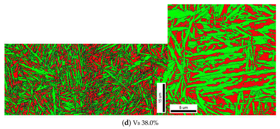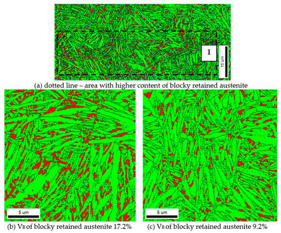For short isothermal annealing time (54 h), non-uniform distribution of blocky retained austenite was found, resulting in the presence of local blocky austenite content significantly higher than the average total austenite content. Figure 10 shows non-uniform distribution of blocky retained austenite resulting from segregation in heat no. 1. In the specimens subjected to isothermal transformation at 210 °C, areas with blocky austenite content of 14.5% and 27.2% were found. In those specimens subjected to isothermal transformation at 225 °C areas of 21.6% and 38.0% were found. This shows that determination of blocky austenite content by EBSD can be burdened with a significant measurement error for this type and degree of microstructure heterogeneity.