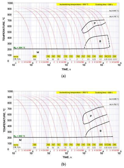 CCT diagrams of the examined steels: (a) heat no. 2, (b) heat no. 3. CR—cooling rate, HV10—Vickers hardness at 10 kgf.