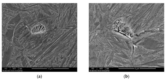 A consequence of primary segregation of alloying elements is the banding of the microstructure especially in the final long and flat products. Through the thickness of the plate there are sequentially distributed bands with different chemical composition and morphology of microstructure components. In nanobainitic steels, the elements that tend to segregate during solidification are Mo, Mn, and Cr [34,35]. Changes in the content of elements in neighboring segregated zones are not sharp, and the boundaries between them are characterized by intermediate chemical compositions between the maximum and minimum content of each segregating element. In particular, differences in element content affect the Ms temperature and the phase transformation kinetics for specific values of heat treatment parameters, for example the austenitizing temperature, cooling rate, and isothermal heating temperature and time, determined by dilatometric tests. As a result of the application of constant isothermal transformation temperature, zones of material with different morphology of microstructure and hardness were found which corresponded to segregation zones [34,35]. The properties of the material, especially yield strength and plasticity, depend on the constituents of the microstructure which are critically weak for particular types of external load. In the area of critical constituents microcracks or local undesirable phenomena associated with the initiation of plastic deformation and/or phase transformation can occur. In nanobainitic steels, the occurrence of primary segregation of a certain intensity (described as a difference in the content of key elements: Mo, Cr, Mn, and Si and distance of neighboring bands) may lead to instability of mechanical properties, especially to a decrease in ductility [35].