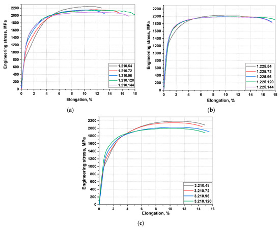 Engineering stress-strain curves of nanobainitic steel obtained from quasi-static tensile tests. (a) heat no. 1, IHT at 210 °C; (b) heat no. 1, IHT at 225 °C; (c) heat no. 3, IHT at 210 °C.