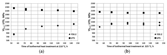 YS0.2 and UTS vs. time of IHT at 210 and 225 °C. Nanobainitic steel, heat no. 1 (a,b) and heat no. 3 (c).