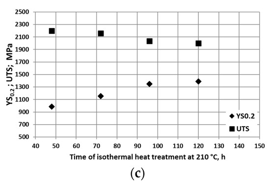 In Figure 8, tensile curves are presented showing the characteristic features of the material depending on the heat treatment parameters. IHT at low-temperature requires time minimum 96 h in order to achieve simultaneously required UTS level and of YS0.2. The use of IHT temperature 225 °C results in a decrease in UTS compare to annealing at 210 °C (Figure 8a,b). The use of shorter heat treatment time, 48, 54, and 72 h for 210 °C, results in a very low YS0.2 value, a very high UTS (UTS/YS0.2 ratio above or close to 2.0), i.e., with a wide range of strain hardening, which leads to total elongation of 11–13% (Figure 8a,c).