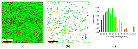 Bainite packets and blocky retained austenite grains morphology (a,b) and size distribution (c). Heat no. 3, 210 °C/96 h, EBSD maps, SEM. Number of analyzed grains 385, average diameter 370 nm.
