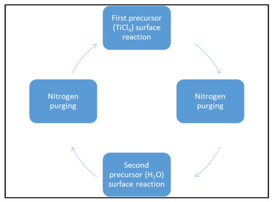 The process of depositing the layer onto the surface with ALD is cyclic. Each cycle is set up from 4 steps (see Figure 1). In the first step, the first precursor (TiCl4) is pulsed into the reactor. TiCl4 is adsorbed to the specimen’s surface and reacts there with the reactive sites (initially, these are organic impurities). In the second step, nitrogen is pulsed into the reactor to purge the excess of the reactant and by-products. In the third step, the second precursor (H2O) is pulsed into the reactor. H2O is adsorbed to the specimen′s surface and reacts there with the reactive sites. In the last step, nitrogen is again pulsed into the reactor to purge the excess of the reactant and by-products. 1100 cycles were made in this study. The simplified equation for this reaction is: