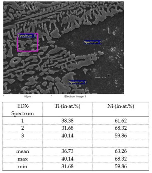 The deposition of a TiO2 layer on the surface of a continuous vertical cast (CVC) NiTi rod and commercial Nitinol was accomplished in a Beneq TFS 200 system at 250 °C. The pulsing times for TiCl4 and H2O were 250 ms and 180 ms, followed by appropriate purge cycles with nitrogen (3 s after the TiCl4 and 2 s after the H2O pulses). The chemical compositions of specimens were as follows: Commercial Nitinol (45 wt.% Ti, 55 wt.% Ni) and the CVC NiTi rod made in-house (composition determined by XRF analysis in-house: Ti 38.9 wt.%, 59.8 wt.% Ni). The detailed microstructure investigation revealed that the CVC NiTi rod containing over 50 at. % Ni, consisted of Ti2Ni and cubic NiTi, with corresponding EDX spectra in the field of investigation—see Figure 2. The chemical composition of the CVC NiTi rod varied through the cross and longitudinal sections because the drawing process was not optimal; the manufacturing problem is described in more detail in our previous study [29].