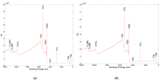 Figure 5a shows an XPS survey spectrum from the TiO2/com.NiTi, and Figure 5b shows a survey spectrum from the TiO2/CVC NiTi rod. Both spectra are similar. They contain the following peaks: Ti 2p3/2 at 458.6 eV, C 1s at 284.8 eV, O 1s at 530.0 eV, Ti 3p at 38.2 eV, Ti 3s at 62.5 eV, N 1s at 401.0 eV, O KLL Auger peak at 974 eV and Ti LMM Auger peak at 1106 eV. No traces of a Cl 2p peak were found, which would be expected at 198 eV. From Ti 2p, O 1s, C 1s and N 1s spectra, a surface composition for TiO2/com. NiTi was calculated to be: 45.6 at.% of O, 17.9 at.% of Ti, 35.7 at.% of C and 0.9 at.% of N. Surface composition for the TiO2/CVC NiTi rod was: 42.0 at.% of O, 16.5 at.% of Ti, 40.4 at.% of C and 1.1 at.% of N. The O/Ti ratio for both specimens was the same, i.e., 2.5. The presence of carbon atoms and part of the oxygen atoms are probably related to surface contamination and/or specimen preparation, taking into account that part of the oxygen is related to surface contamination. The Ti/O ratio of 2.5 indicated the TiO2 composition of the deposited films on both specimens. XPS data on the surface composition show that the TiO2/CVC NiTi rod had a higher concentration of carbon, which may be related to the higher degree of surface contamination.
