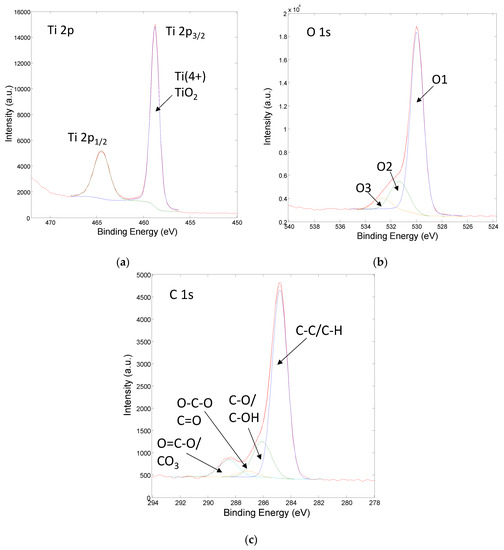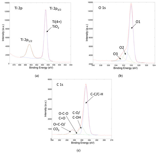 The X-ray Photoelectron Spectroscopy (XPS) analyses were performed in order to identify the oxidation states of the elements on the surface of the Ti-oxide films and calculate their surface composition. XPS analyses were carried out on the PHI-TFA XPS spectrometer (Physical Electronics Inc., MN, USA), equipped with a monochromatic Al source. The analysed area was 0.4 mm in diameter, and the analysed depth was about 3–5 nm. High energy resolution XPS spectra were taken with a pass energy of 29 eV, energy resolution of 0.6 eV and energy step of 0.1 eV. Quantification of the surface composition was performed from the XPS peak intensities, taking into account the relative sensitivity factors provided by the instrument manufacturer [32]. Two places on every specimen were analysed, and the average composition was calculated. Chemical bonding of the elements was deduced from the high-energy resolution XPS spectra using reference XPS1. The Multipak software package (version 9.9, ULVAC-PHI Inc., Japan) was used for XPS spectra processing. The error in the binding energy of the measured spectra is ±0.3 eV.