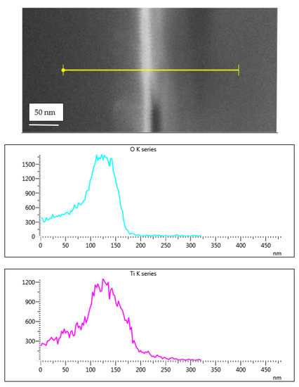 In accordance with the XPS analyses, the results of the performed line EDX analysis on the formatted TiO2 layer confirmed the increased contents of Ti and O (Figure 8) in both specimens, exactly where the TiO2 layer formed. The TiO2 layer is seen as a bright area. The increased concentration profiles for Ti and O are appropriate, as well as the width of the range corresponding to the resulting thickness of the TiO2 layer, as seen with SEM (Figure 3). Due to the extremely thin TiO2 layer, only line EDX analysis could be used in this case, as the usual point/planar EDX analysis would capture a significantly larger volume, and in this way, the signal from the base alloy would be obtained, and the results would be irrelevant.
