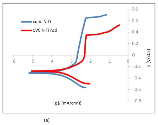 Figure 9 shows the potentiodynamic curves for different specimens: CVC NiTi rod, commercial Nitinol (com. NiTi), CVC NiTi rod with a TiO2 layer (TiO2/CVC NiTi rod) and commercial Nitinol with a TiO2 layer (TiO2/com NiTi). All the measurements were carried out in Hank’s solution at body temperature (37 °C). The electrochemical parameters of the potentiodynamic test are shown in Table 1. Corrosion potentials (Ecorr) and corrosion current densities (icorr) were obtained from the Tafel region. Following that region, the specimens exhibited a passive region, which was limited by the breakdown potential (Ebd), corresponding to the transpassive oxidation of metal species. The corrosion current density was the lowest for TiO2/com NiTi (0.16 μA/cm2), which means that the passive layer on these specimens was the most stable and resistant to external influences. This is followed by specimens of com. NiTi (0.30 μA/cm2), TiO2/CVC NiTi rod (0.34 μA/cm2) and CVC NiTi rod (0.44 μA/cm2). The formation of a passive layer is characterised by the width of the passive region. The wider the passive region, the more corrosion-resistant the material is. The CVC NiTi rod had the smallest passive range has a (from −100 mV to 330 mV, which is 430 mV), followed by TiO2/CVC NiTi rod (650 mV), com. NiTi (730 mV) and TiO2/com. NiTi. The CVC NiTi rod had the lowest breakdown potential (329 mV), followed by com. NiTi (634 mV) and TiO2/CVC NiTi rod (643 mV), while TiO2/com. NiTi did not reach the breakdown potential in the measurement range. As the name already suggests, this passive layer breaks down at this potential, which enables the formation of pits on the surface. This is also accompanied by a rapid increase in anode current due to the passivity breakdown. The corrosion rate is, thus, the smallest for TiO2/com. NiTi; the TiO2/CVC NiTi rod and com. NiTi are far away but very close together, while the CVC NiTi rod shows the highest corrosion rate or the lowest corrosion resistance by the potentiodynamic test.
