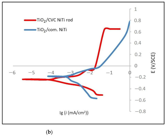 Potentiodynamic curves for: (a) CVC NiTi rod and com. NiTi and (b) TiO2/CVC NiTi rod and TiO2/com. NiTi.