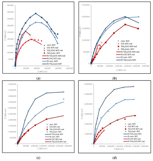 Nyquist diagrams for the CVC NiTi rod, commercial Nitinol, TiO2/CVC NiTi rod and TiO2/commercial Nitinol after (a) 12 h, (b) 96 h, (c) 168 h and (d) 192 h of immersion.