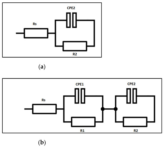 Equivalent circuits for the interpretation of the measured impedance spectra with: (a) one resistance and (b) two resistances.