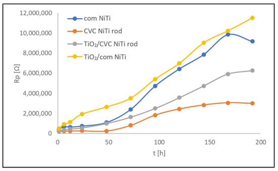 The diagram of total corrosion resistance (Figure 12) shows clearly that the corrosion resistance increased with time for all 4 specimens. This was a consequence of the formation of a protective oxide layer. In the case when the TiO2 layer was deposited on the specimen, it is noticeable that the corrosion resistance was increasing in the initial time, while for the CVC NiTi rod and commercial Nitinol, in the initial 48 h, there was no significant change in resistance as a consequence of the thin oxide layer. The highest corrosion resistance was for the TiO2/commercial Nitinol, followed by the commercial Nitinol and the TiO2/CVC NiTi rod, and the poorest corrosion resistance was for the CVC NiTi rod. The cause of the poorer corrosion properties of the CVC NiTi rod was inhomogeneity in the chemical composition and higher nickel content than in the commercial NiTi.