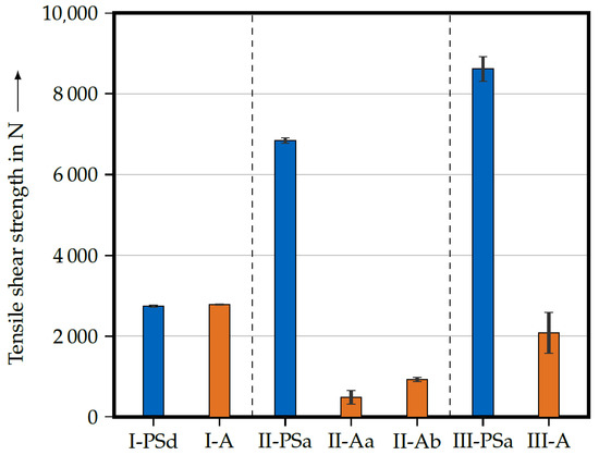 Tensile shear strengths of selected joints (blue, FPJ; orange, adhesive bond) including the standard deviation of five tensile shear specimens.