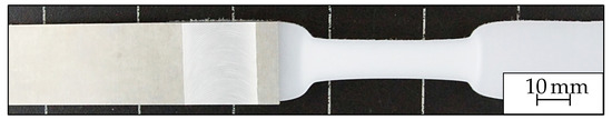 For the material combination PE-HD and EN AW-6082-T6 (I), the composites produced with FPJ showed the same tensile shear strength as the adhesive composites. Here, the total adhesive forces exceeded the internal strength of the plastic joining partner. Therefore, the maximum strength did not lead to the joint’s breakage but led to the elongation of the plastic and its material hardening due to the alignment of the macromolecules (strain hardening) (see Figure 5). The shown tensile shear strengths of approximately 2700 thus refer to the stress area (cross-section of plastic joining partner) of 125 . The measured stress value of correlates well with the value of 23 given in the datasheet (see Table A2). To be able to investigate the joint strength more closely, the overlap length should be reduced in further investigations in order to obtain a fracture in the joining zone.