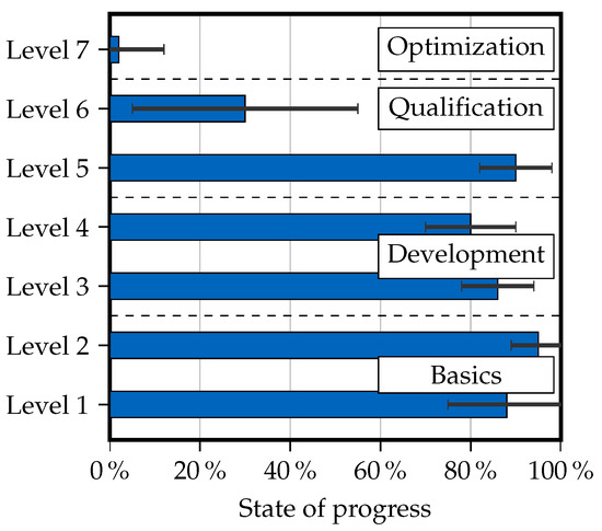 The technology readiness level method is a procedure to assess a technology’s maturity and promote its further development [17]. This assessment provides the basis for an effective technology and innovation management for the industrial sector [18]. According to Mankins [17], the classification mainly used in aviation is divided into nine individual levels. The first two stages comprise the assessment of theoretical knowledge about a technology. TRL 3–5 consider the technical implementation from the proof of concept to the implementation in an industrial production environment. TRL 6 and 7 refer to the production of a prototype. TRL 8 and 9 apply to the implementation in an actual flight system. With the help of this very detailed classification, a categorization of novel manufacturing methods according to their operational readiness is possible. It should be noted that the transitions between the individual stages can be fuzzy.