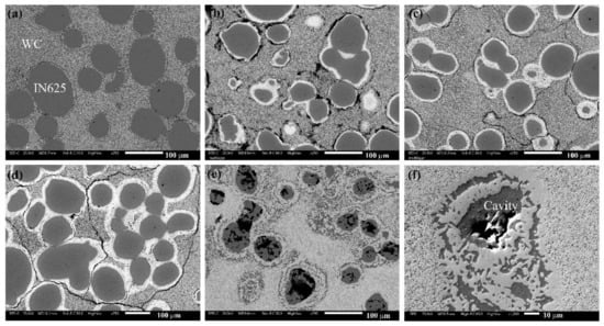 WC–IN625 microstructure of the pre-compacted (a), and sintered specimens at 1250 °C (b), 1275 °C (c), 1300 °C (d),1350 °C (e,f).