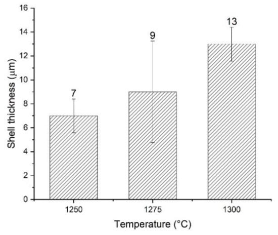 Shell thickness surrounding the IN625 powder after at 1250 °C, 1275 °C and 1300 °C.