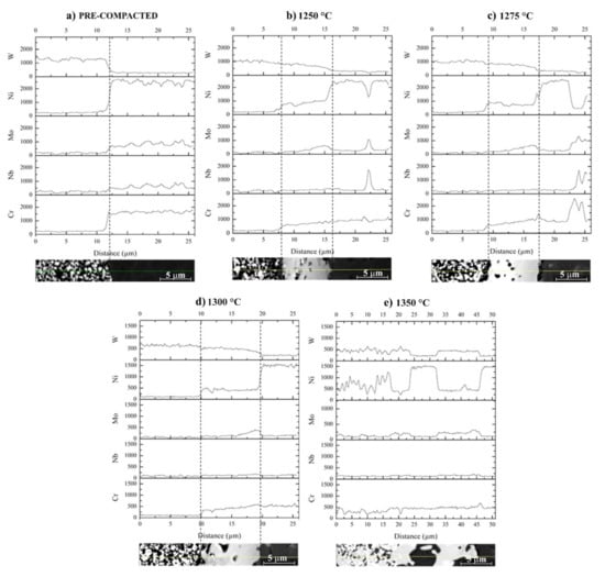 Ni, Cr, Mo and Nb are obviously present in the IN625 powder. However, W is present in the WC particles area. The variation of the Cr, Mo and Nb insider IN625 particles will be analyzed later (Figure 6). Considering the interaction area between IN625 particle and WC carbides, in the pre-compacted condition, the concentration gradients are sharp, indicating that no diffusion phenomena occurred at the WC–IN625 interface. In the 1250 °C sintered specimen, an interdiffusion layer with a thickness of around 8 µm formed, confirming the shell thickness reported in Figure 3. The concentration profiles displayed a continuous and gradual variation of Cr and W elements. In contrast, Mo showed a concentration peak near the IN625, and Ni drastically decreased with a stepped trend in the interaction area. The Mo amount in the interdiffusion layer was higher than that in the IN625, suggesting the formation of a Mo-rich phase. Increasing the sintering temperature up to 1300 °C, the thickness of the interaction region increased and the concentration peak of Mo near the IN625 particle was confirmed.