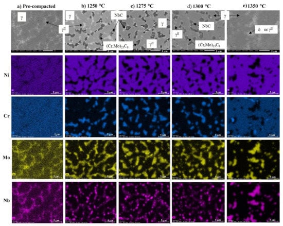 Figure 6 shows the microstructural evolution and the element mapping in the IN625 particle in the pre-compacted condition and after sintering at 1250 °C, 1275 °C, 1300 °C and 1350 °C.