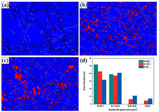 Electron backscatter diffraction (EBSD) phase maps and grain area distribution of austenite of samples. (a) 0.06C steel. (b) 0.15C steel. (c) 0.3C steel. (d) The grain area distribution of austenite in different samples.