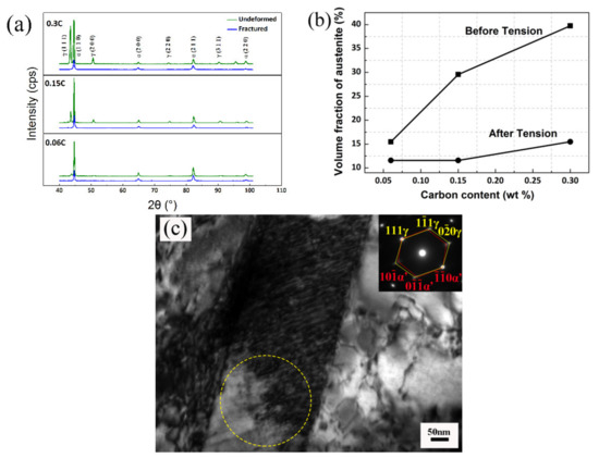 The XRD patterns are displayed in Figure 4a, and the volume fractions of austenite before and after tensile tests obtained from XRD results are shown in Figure 4b. The volume fraction of austenite presented to be low for the sample with C content of 0.06%. As C content increased from 0.06% to 0.3%, the volume fractions of retained austenite before tension increased from 15.5% to 39.7%, while the austenite volume fractions after tension for the investigated steels were similar. Furthermore, the sample after tensile test was studied by TEM, and the selected area diffraction pattern (SADP) in Figure 4c demonstrates the Kurdjumov-Sachs orientation relationship (K-S OR) between the martensite and retained austenite grains, indicated by yellow circle, which confirmed the appearance of strain induced martensite.