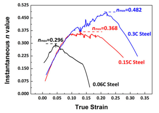 The work hardening behavior was characterized by the instantaneous n value [16,17], as shown in Figure 6. The experimental steels exhibited three stage work hardening behavior: the instantaneous n value started to increase gradually in stage I, until it reached the peak value nmax, and decreased slowly with further straining in stage II before finally decreased rapidly in stage III. The 0.3C steel shows the highest instantaneous n value, while the 0.06C steel shows the lowest one, and the nmax values of the 0.06C steel, 0.15C steel, and 0.3C steel are 0.296, 0.368, and 0.482, respectively. The higher n value is often related to the higher level of work hardening, which means that the work hardening ability of the investigated steels has been improved with the increase of C content.