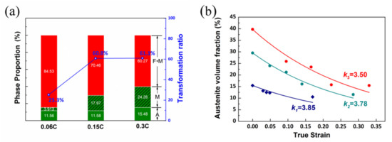 where fγ0 is the initial austenite volume fraction, fγ is the austenite volume fraction at strain ε, and k is the mechanical stability of austenite. As exhibited in Figure 7b, the k values are 3.85, 3.78, and 3.50 for 0.06C steel, 0.15C steel, and 0.3C steel, respectively. A higher k value means the larger driving force of martensite transformation and, therefore, the stability of austenite decrease.