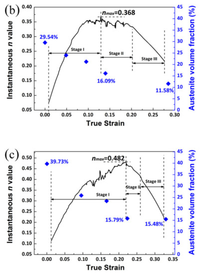 As illustrated in Figure 6, 0.3C steel showed the highest instantaneous n value. In order to investigate the reason why the work hardening ability rose with the increase of C content, the variation of austenite volume fraction and work hardening behavior were studied together, as shown in Figure 8. In stage I, the transformation volume fraction of austenite increased with the enhancement of C content. As the austenite stabilities are improved with the increasing C content (Figure 7b), the strains of the nmax values of the experimental steels increased from 0.05 to 0.23, which means the increasing C content prolonged the process of stage I. Therefore, the largest nmax value was obtained in 0.3C steel because the largest amount of austenite transformed in the greatest strain range, which could continuously provide work hardening for the steel. The elongation of the medium Mn steel is related to its work hardening ability, and the progressive work hardening would retard the localization of deformation and enhance the uniform elongation [1]. Therefore, the TEL of 0.3C steel is larger than those of the other two experimental steels with lower C contents.