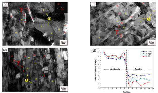 TEM micrograph and Mn concentration in austenite and ferrite. (a) 0.06C steel. (b) 0.15C steel. (c) 0.3C steel. (d) Mn concentration in austenite and ferrite.