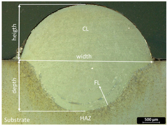 Optical microscopy image showing the morphology of a single-track clad produced by the DLD technique depositing Metco 42C powder on a 42CrMo4 steel substrate. CL—Cladding Layer; FL—Fusion Line; HAZ—Heat-affected Zone.