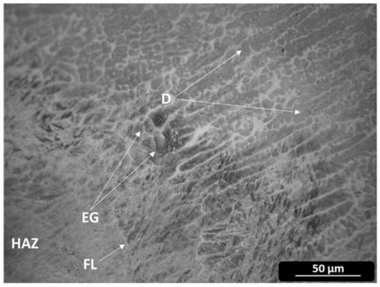 Optical microscopy image showing the solidification structure in the M2_6_15 sample. D—Dendrites; EG—Equiaxed Gains; FL—Fusion Line; HAZ—Heat-affected Zone.