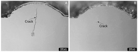 OM images of cracks formed in the centre of the cladding in M3_6_10 samples (A) with and (B) without PHT.