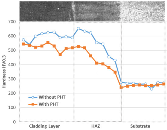 The influence of the PHT in microstructure has a direct consequence on mechanical behaviour. Microhardness profiles were determined to evaluate this influence on the mechanical response. Figure 8 shows microhardness evolution across the clad and substrate, including HAZ.