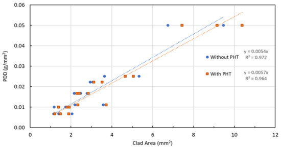 Powder Deposition Density (PDD) is a widely used parameter that can express the combined influence of feed rate, scanning speed, and laser spot size (φ) [37,38]. The powder deposition density is defined by Equation (2). Figure 9 shows that the cladding area increases linearly with the increase in the PDD parameter and that PHT has a negligible influence on this relationship.
